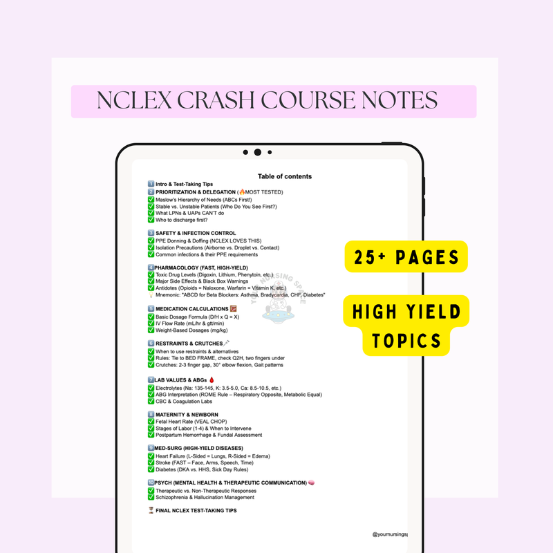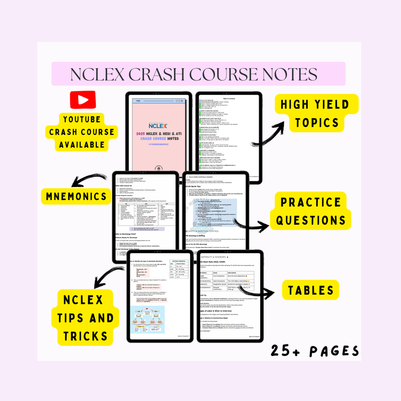 These 2025 NCLEX Crash Course Notes are packed with high-yield content to help you study smarter, not harder! Designed for nursing students who need quick, concise, and effective review material, this guide focuses on must-know topics that the NCLEX LOVES to test. This is the notes that you can follow along with the 45 mins free crash course we posted on Youtube!